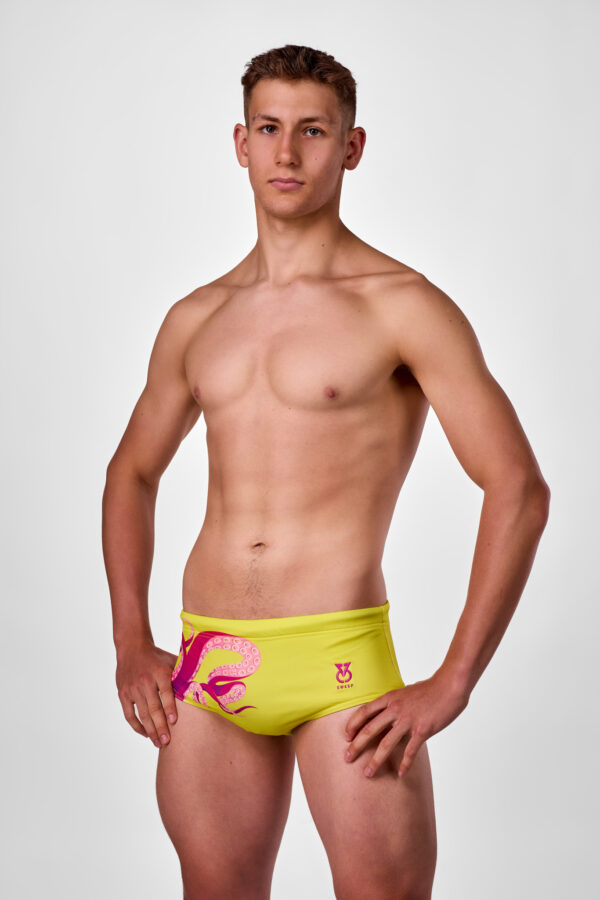 Strój kąpielowy "KRAKEN" to strój pływacki o wyjątkowym wzornictwie z rysunkiem różowych macek ośmiornicy na jaskrawym żółtym tle.