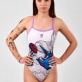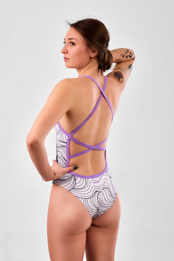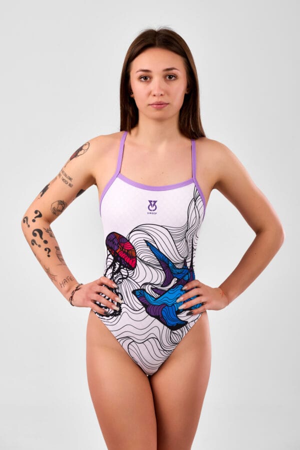 To połączenie kreatywności, jakości i wyjątkowej innowacji, które sprawiają, że "MEDUSA" to coś więcej niż zwykły strój, to wyraz artystycznej wizji na basenie. Biały materiał na którym po zamoczeniu pojawiają się subtelne łuski. Idealnie sprawdzi się na basenie podczas treningu, wodach otwartych czy też plaży. Na piersi umieszczone jest fioletowe logo, zgodne z ramiączkami.